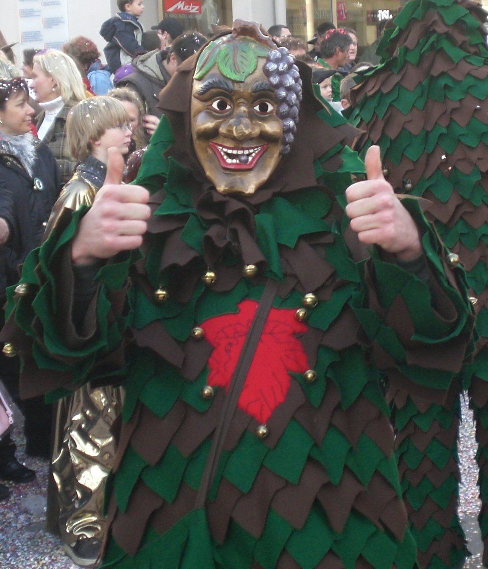 Die Maske ist aus einem Holzklotz geschnitzt. Sie ist sehr freundlich und hat auf der linken hälfte eine Weintraube und an der Stirn ein Rebenblatt eingearbeitet.