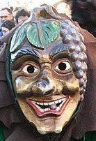 Die Maske ist aus einem Holzklotz geschnitzt. Sie ist sehr freundlich und hat auf der linken hälfte eine Weintraube und an der Stirn ein Rebenblatt eingearbeitet.